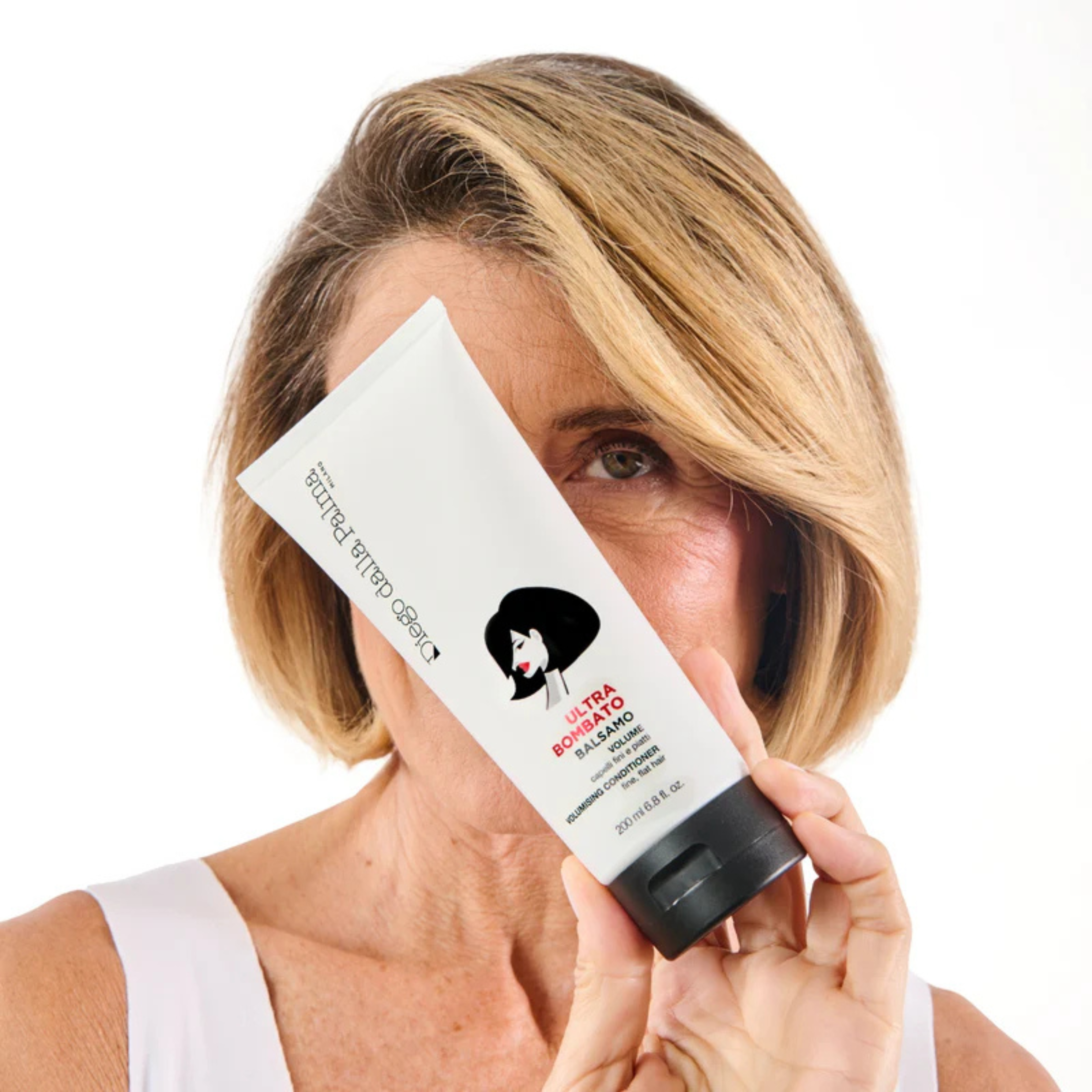 Start by washing your hair with volume shampoo and rinsing thoroughly. Gently squeeze out excess water. Take an appropriate amount of conditioner based on your hair length and thickness, then distribute it evenly between your hands. Apply the conditioner to the lengths and ends, avoiding the roots to prevent weighing down the scalp. Use your fingers or a wide-tooth comb to evenly distribute the product. Rinse with lukewarm water until all traces of conditioner are removed. Proceed with drying and styling using the VOLUMISING SPRAY.