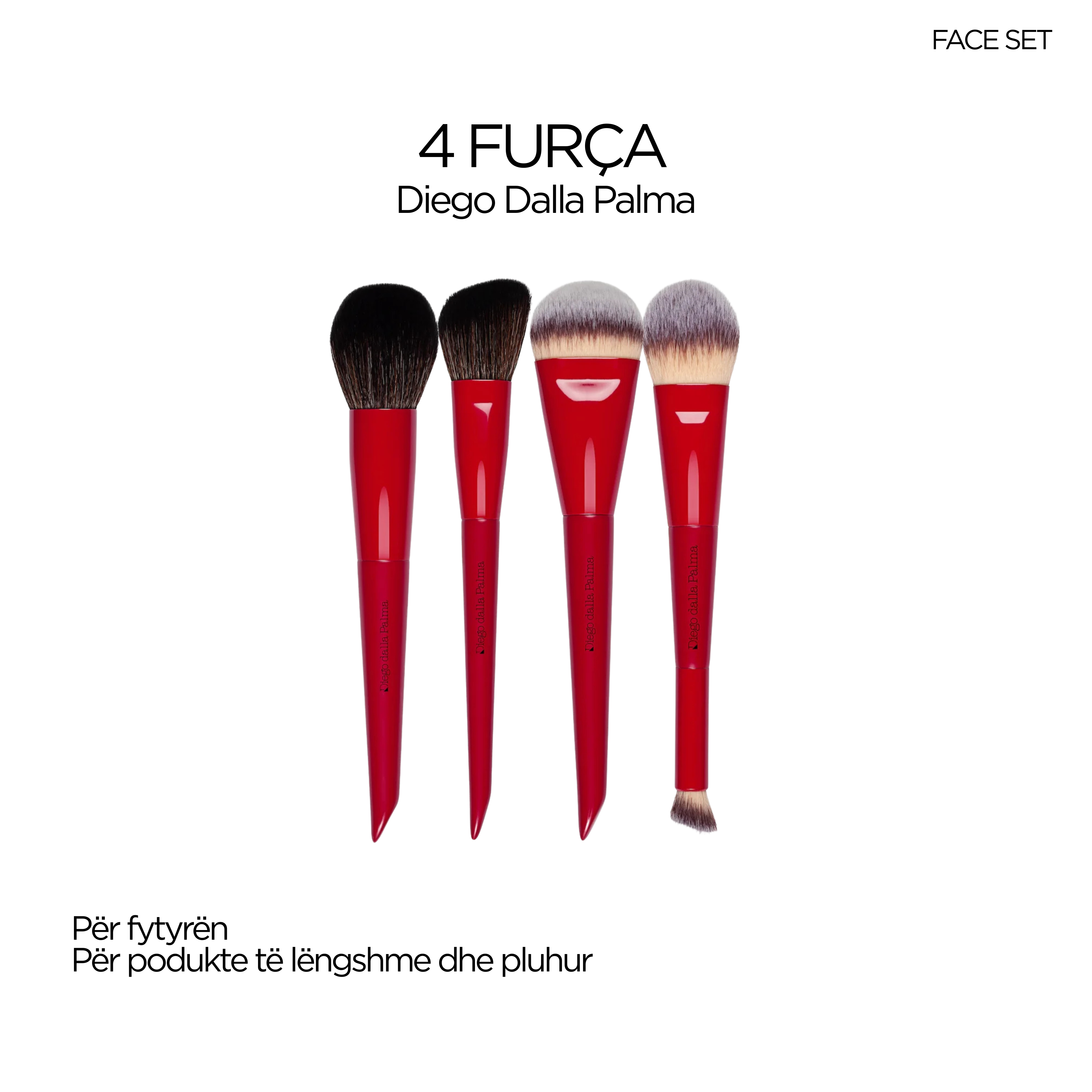Furçat e reja të kuqe Diego Dalla Palma janë seti ideal për këdo që kërkon performancë profesionale dhe estetikë në çdo detaj. Seti përmban 4 furça për fytyrën, të përshtatshme si për produkte likuide ashtu edhe për ato në formë pluhuri, duke garantuar aplikim të njëtrajtshëm, të kontrolluar dhe pa mbetje. Fijet e buta dhe rezistente sigurojnë shpërndarje perfekte të produktit, ndërsa dizajni ergonomik i dorezës ofron rehati dhe precizion maksimal në çdo përdorim. Një zgjedhje ideale si për makeup artistë profesionistë, ashtu edhe për ata që duan rezultate të përsosura në rutinën e përditshme, ky koleksion vjen si set, duke ju ofruar gjithçka që ju nevojitet për një bazë të kuruar dhe profesionale nga fillimi deri në fund.